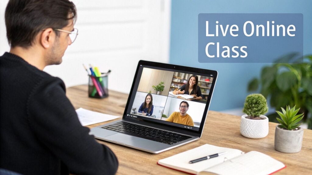 Synchronous learning is all about that live, real-time energy. Think of it as the closest you can get to that in-person workshop buzz without anyone having to leave their house. When you and your students are all in the same virtual room at the same time, it creates an incredible sense of community and shared momentum.